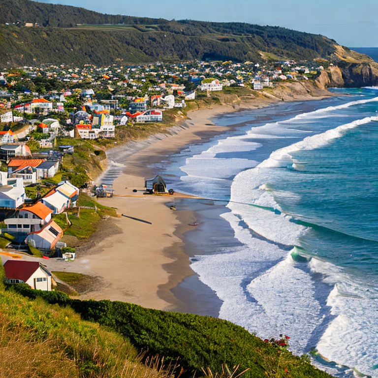 We see a sweeping shot of a small coastal town, with the ocean in the background. We hear the sound of waves crashing against the shore.