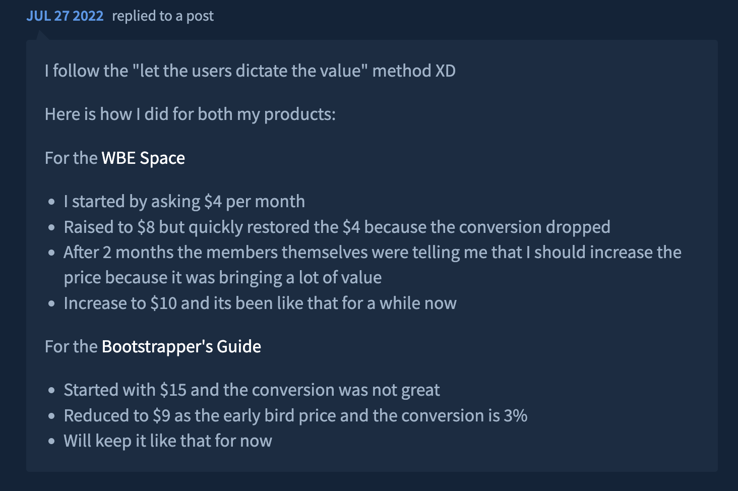 In the image above you can see an example of one of my answers to a post where the OP asked about the pricing of our products…