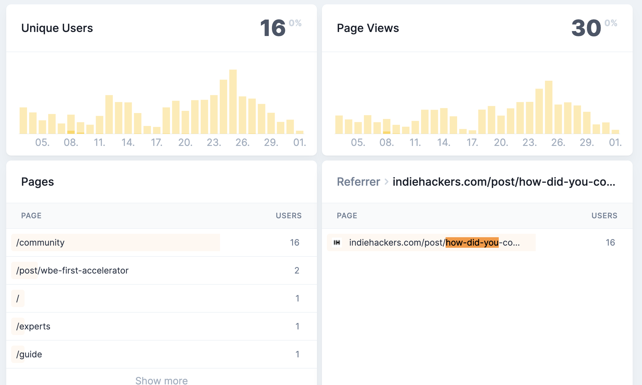 In fact, in the last 30 days, my website got 725 new users coming from Indie Hacker’s website.
