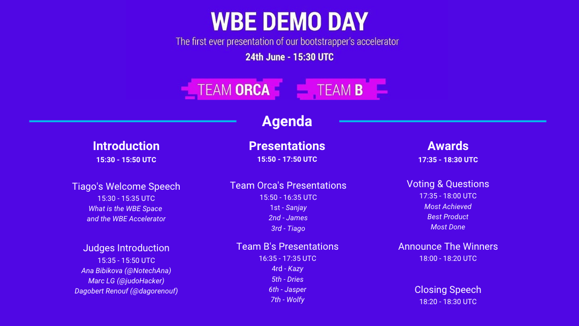 In total there were 9 WBE members ready to participate in the first accelerator batch and we decided to split into two teams