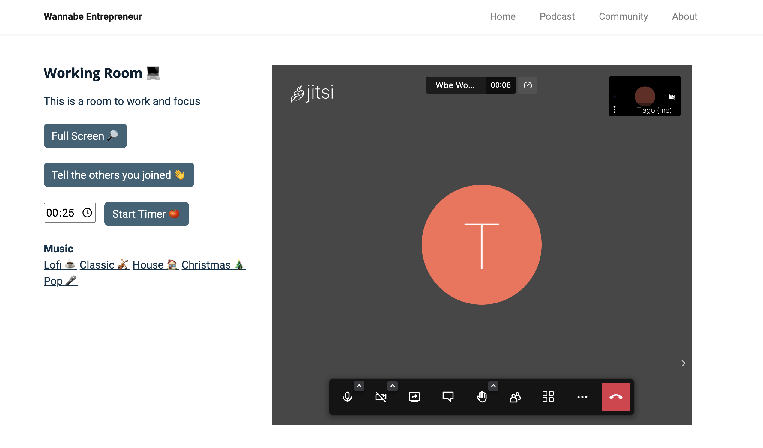 - Work Room 💻: Entrepreneurs turn on the camera and work together in their individual tasks. Is like being in an office. I also implemented a shared Pomodoro timer, so normally we work for 30min, have a 5min chat, and restart