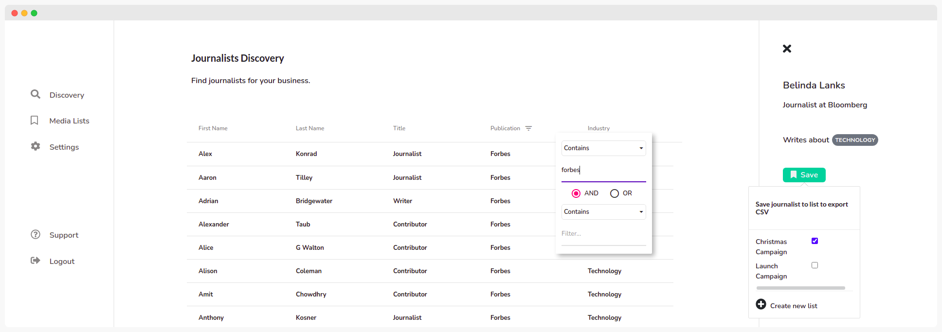 Save selected journalists to your media lists so you can pitch them when you’re ready.